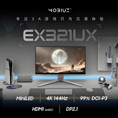 对于追求3A游戏大作与沉浸影音体验的用户,明基MOBIUZ EX321UX是一个值得关注的选择。它采用京东方α-MLED技术驱动的31.5英寸玻璃基主动式Mini LED面板,拥有4608颗高密度LED灯珠和1152个独立调光分区,能呈现极深的黑场和明亮的峰值,有效抑制光晕。结合99% DCI-P3广色域和144Hz刷新率,电影和游戏中的色彩过渡真实生动,画质表现向专业级别靠近。同时,其背后的COG玻璃基和AM主动式驱动方案有效改善频闪与亮度均匀性,持续使用更为舒适。